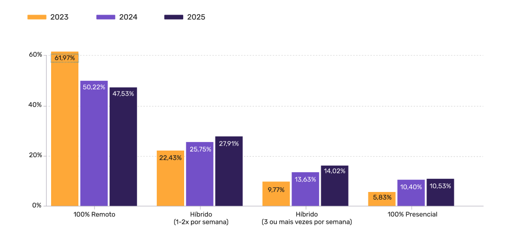 Entretanto, o remoto vem em queda: 47,53% atuam totalmente de forma remota em 2025, queda de 2,69 p.p. em relação a 2024. Ao comparar desde 2023, a retração chega a 14,44p.p., o que indica diminuição das posições remotas e crescimento do modelo híbrido.