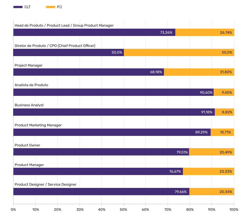 Contudo, é importante ressaltar que esse percentual é um retrato geral. Se olharmos por cargos, os profissionais PJ são maioria em cargos de gestão e liderança. Já PMs, PMMs, POs, analistas de Produto e Service Designers são mais contratados via CLT.