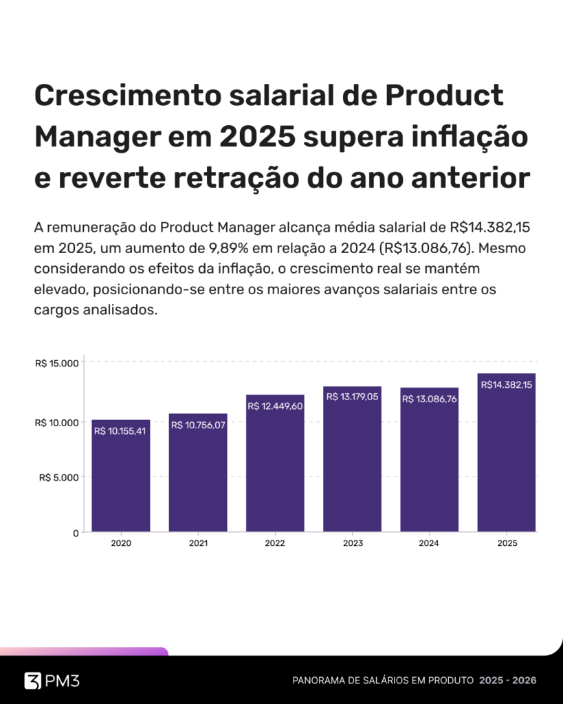 A remuneração do Product Manager alcança média salarial de R$14.382,15 em 2025, um aumento de 9,89% em relação a 2024 (R$13.086,76). Mesmo com os efeitos da inflação, o crescimento real se mantém elevado, posicionando-se entre os maiores avanços salariais entre os cargos analisados. Ou seja, uma oportunidade para quem está em fase de transição dentro da área (em um cargo de PO, por exemplo) e mira uma nova atribuição com um salário mais competitivo.